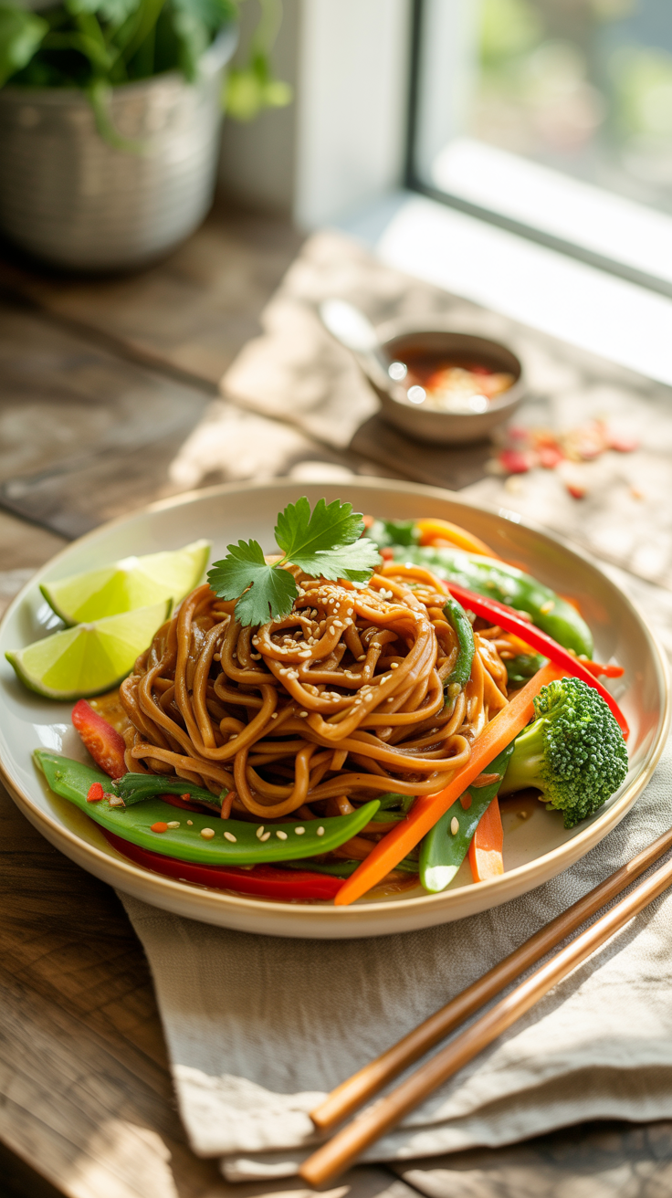 Knackiges Gemüse trifft auf weiche Nudeln, dazu eine würzige Sauce mit Sojasauce, Sesamöl und einem Hauch Knoblauch. Jedes Bisschen schmeckt nach Leichtigkeit und ein bisschen Fernweh.