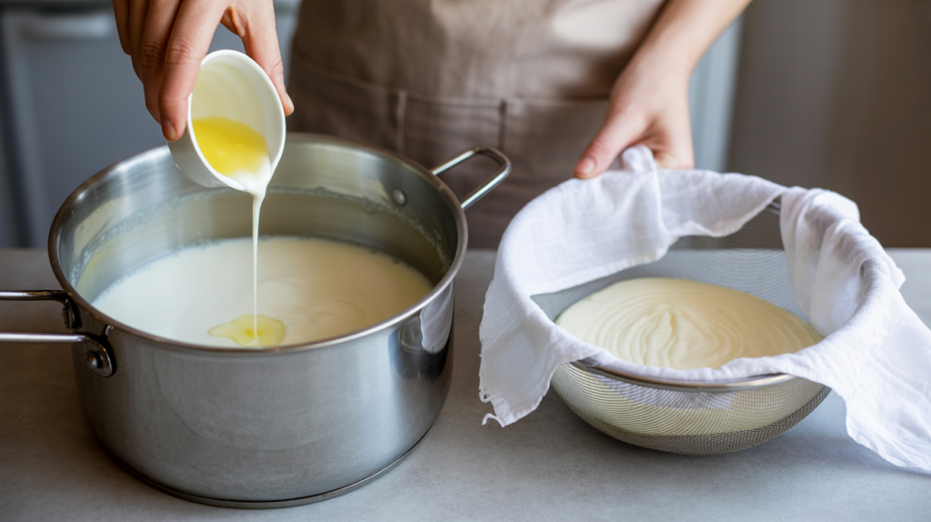 Zitronensaft oder Essig sorgt dafür, dass sich die Milch trennt. Dieser Schritt ist entscheidend, damit sich die festen Bestandteile vom flüssigen Teil lösen.