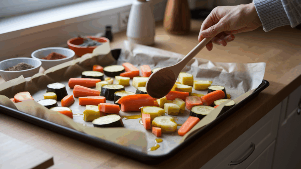 Gib dem Gemüse genug Platz auf dem Blech. Wenn die Stücke zu eng liegen, dämpfen sie statt zu rösten. So bekommst du keine goldbraunen Kanten, sondern weiches Gemüse.