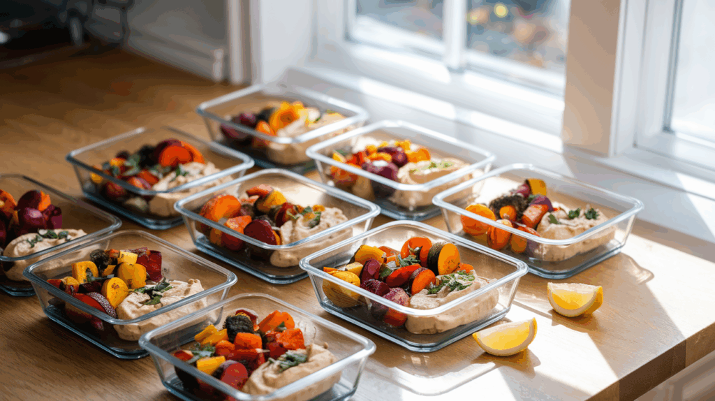 Bunte Schalen voller geröstetem Gemüse warten im Kühlschrank. Karotten leuchten in warmem Orange, Zucchini glänzen goldbraun, Paprika bringen Farbe auf den Teller. Dazu ein cremiger Hummus, zart gewürzt und herrlich samtig.