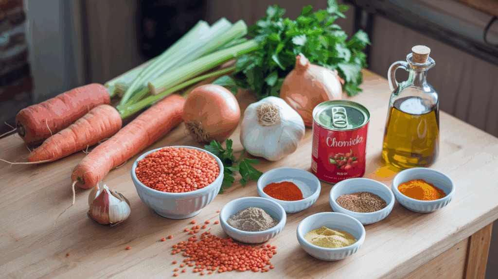Damit deine rote Linsensuppe perfekt gelingt, brauchst du nur ein paar einfache Zutaten. Jede einzelne bringt Geschmack, Sättigung oder Würze ins Spiel: